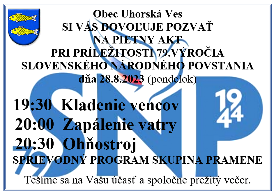 28.8.2023 o 19:30 si pri pomníku pripomenieme položením vencov 79. výročie SNP. Spomienková akcia bude pokračovať zapálením vatry na klzisku a ohňostrojom.